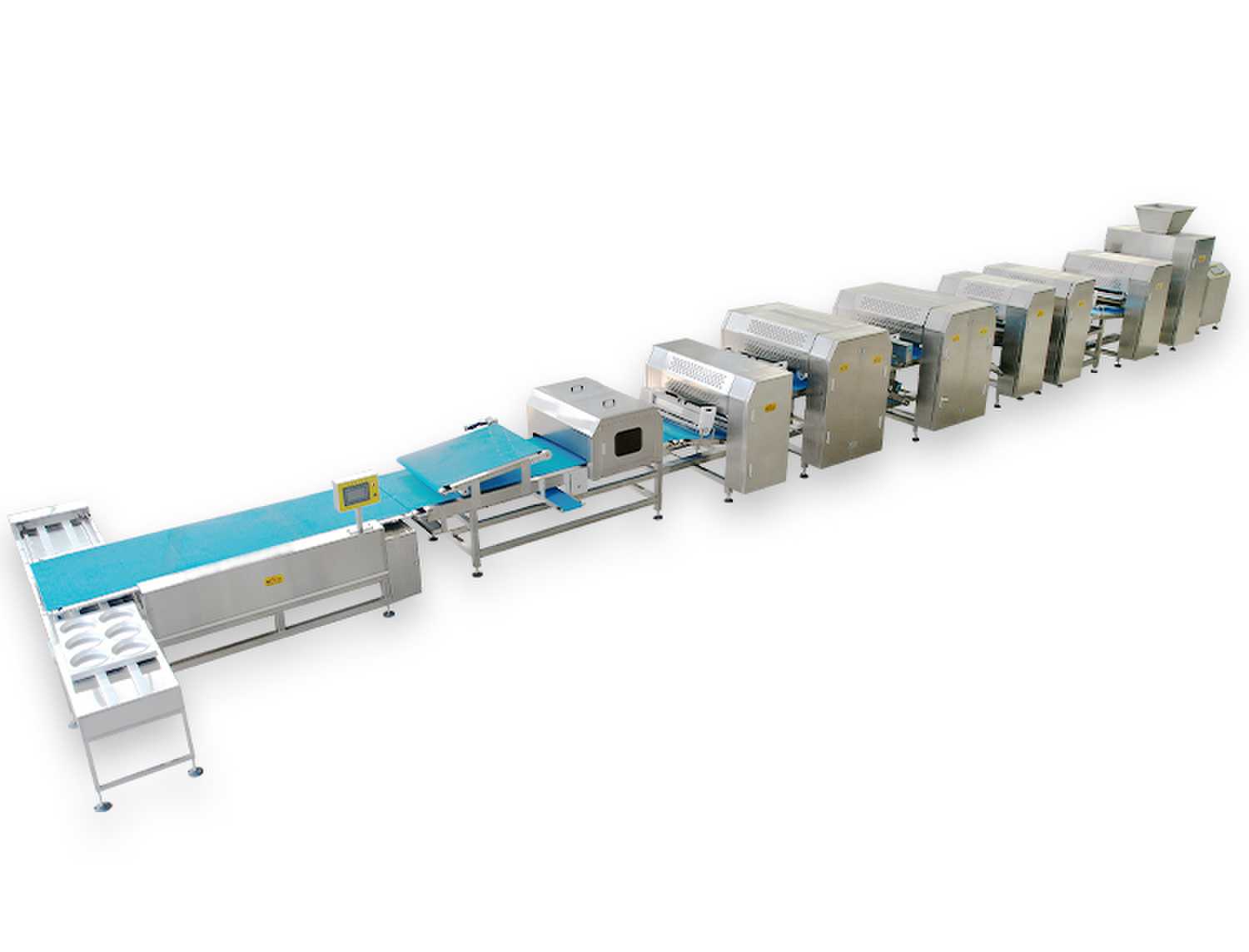 同時打孔壓制內(nèi)環(huán),脫模不會卡殼,切出來的餅,筋度穩(wěn)定。操作系統(tǒng)采用 PLC 和觸摸屏操作更加方便,仿純手工制作,確保制品焙烤工藝不受影響,外觀亞整、光滑、自然、美觀、圖案清晰。