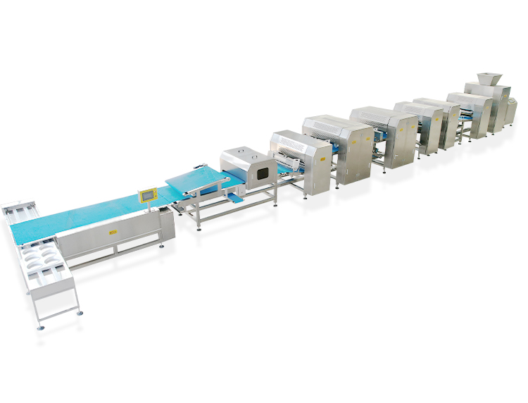 主要功能:面皮經(jīng)過壓面輥裝置的輾壓延展,使面皮更有光澤、品質(zhì)更加穩(wěn)定;壓面輥皆有厚薄調(diào)整裝置來設(shè)定面皮之厚度以增加或減少產(chǎn)品的重量;由氣動式或機(jī)械式分切裝置把面片切成成品,同時打孔壓制內(nèi)環(huán),脫模不會卡殼,切出來的餅,筋度穩(wěn)定。操作系統(tǒng)采用 PLC 和觸摸屏操作更加方便,仿純手工制作,確保制品焙烤工藝不受影響,外觀亞整、光滑、自然、美觀、圖案清晰。
