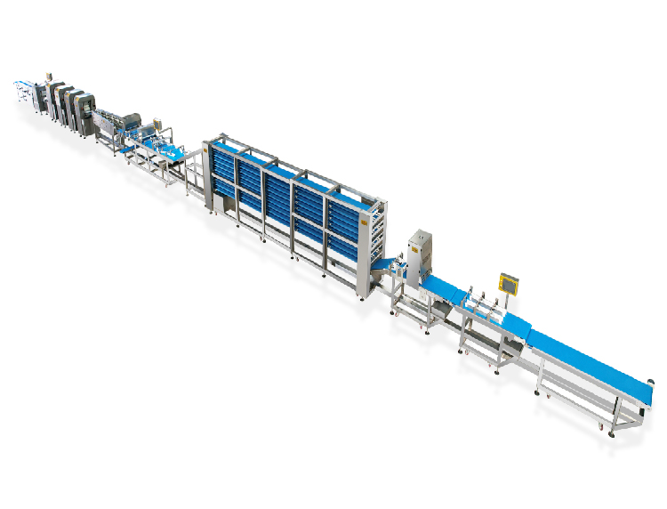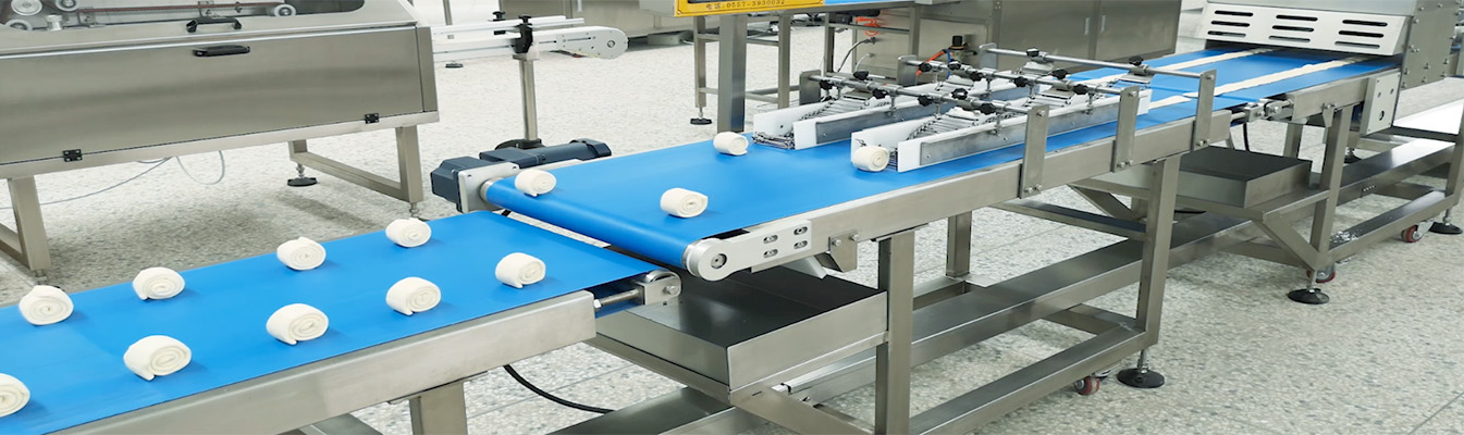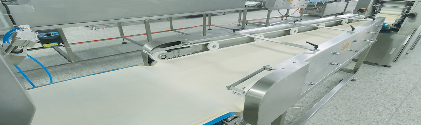 面團(tuán)輸送—延壓打薄——制成面帶——延展——制成薄皮——自動上下抹油——自動撒蔥下料——自動層酥齊卷——面卷封口切斷——自動卷型——餅皮狀定型——上下覆膜